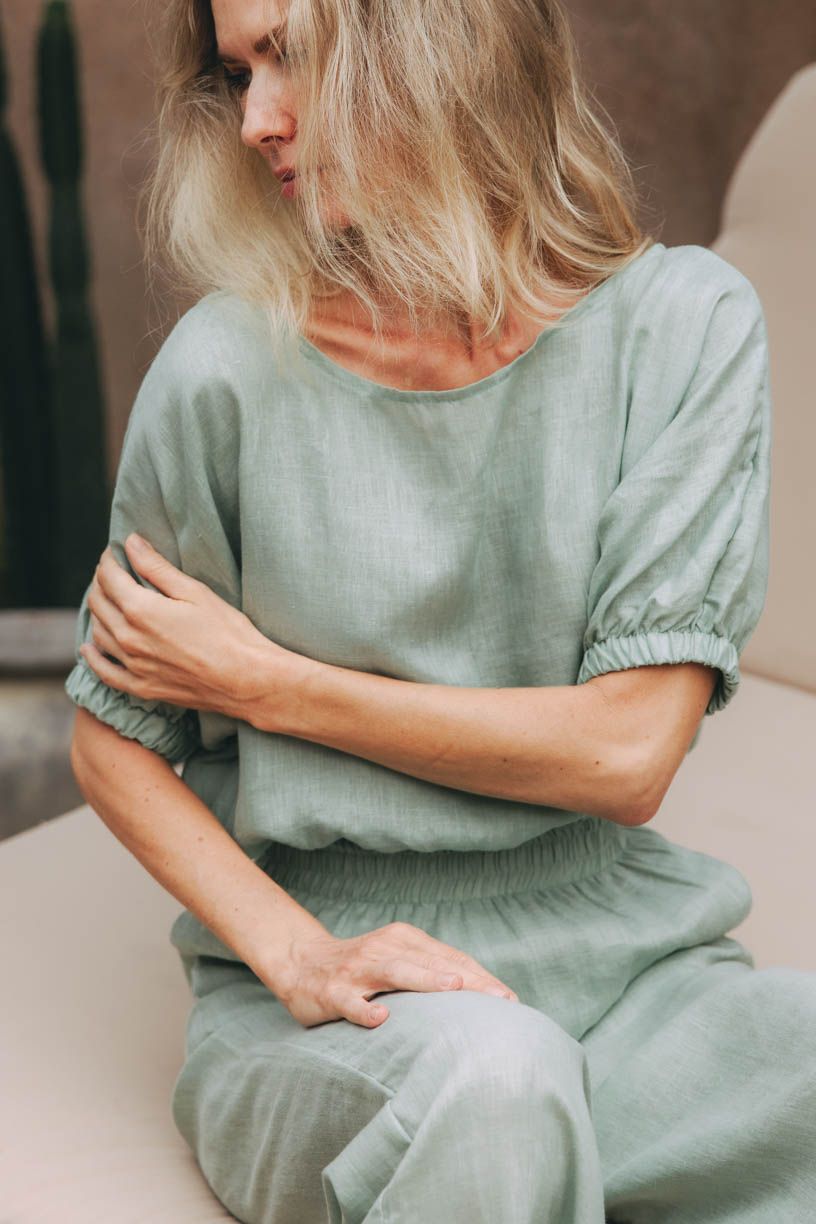Širší okrúhly výstrih dokonale dopĺňajú voľné balónové rukávy zakončené riasením a gumou, rovnako ako spodný lem. Máte tak úplne vo svojej réžii, ako silný efekt podkasania vykúzlite.