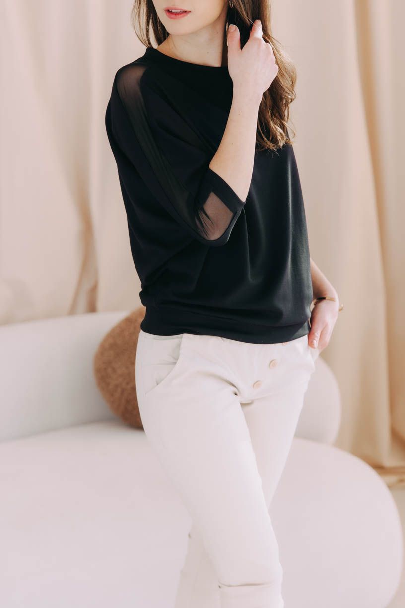 V páse je tričko obopnuté, aby ste si ho mohli podkasať a nastaviť podľa vlastných preferencií. O efektný detail sa postarajú rukávy s jemne priesvitným pruhom našitým od krku cez rameno až k lakťu.
