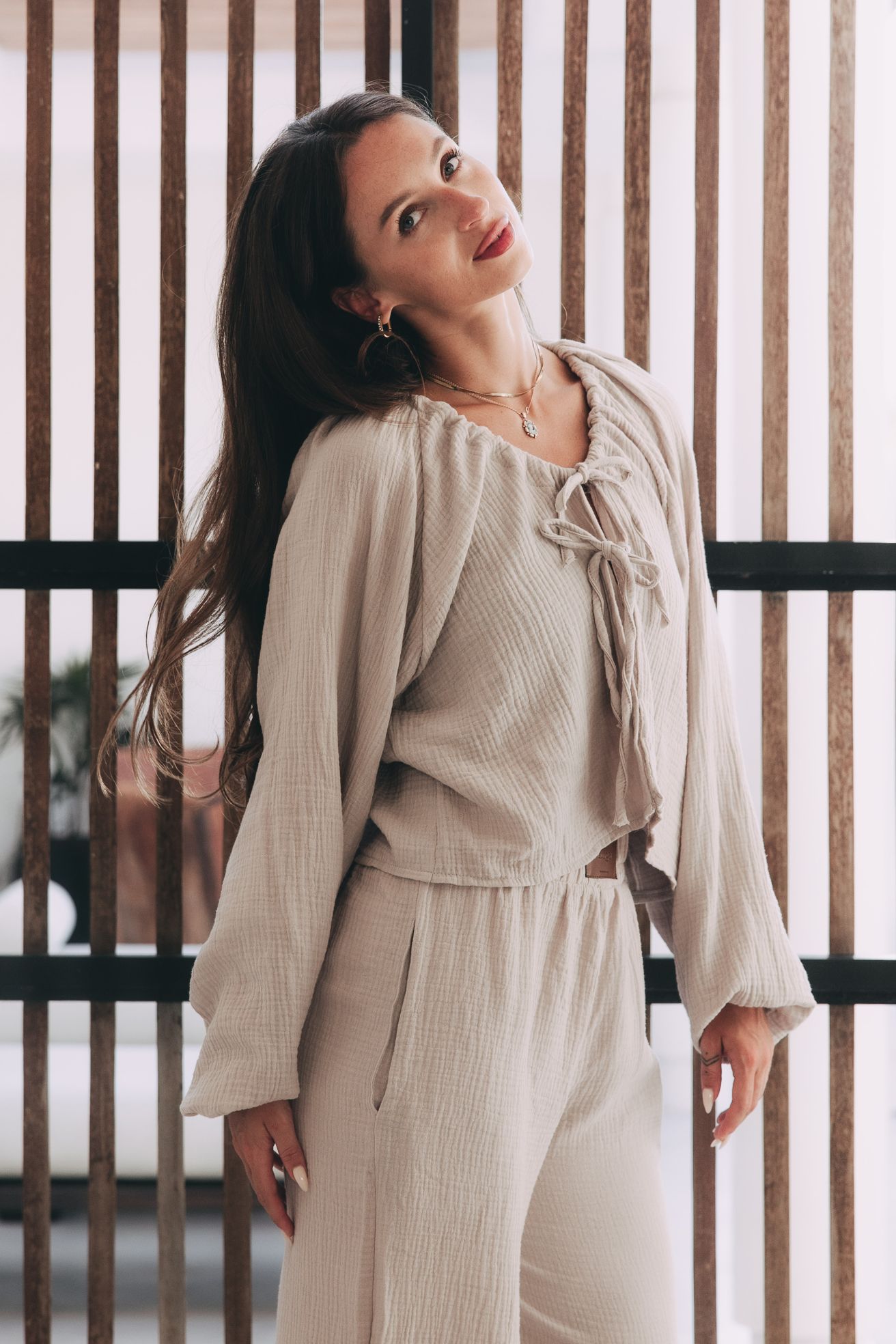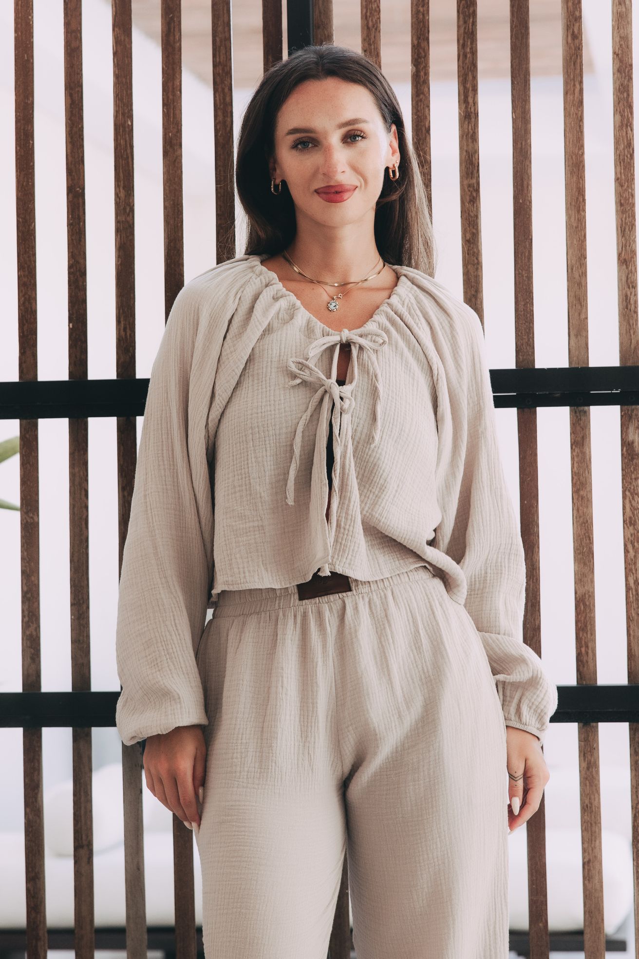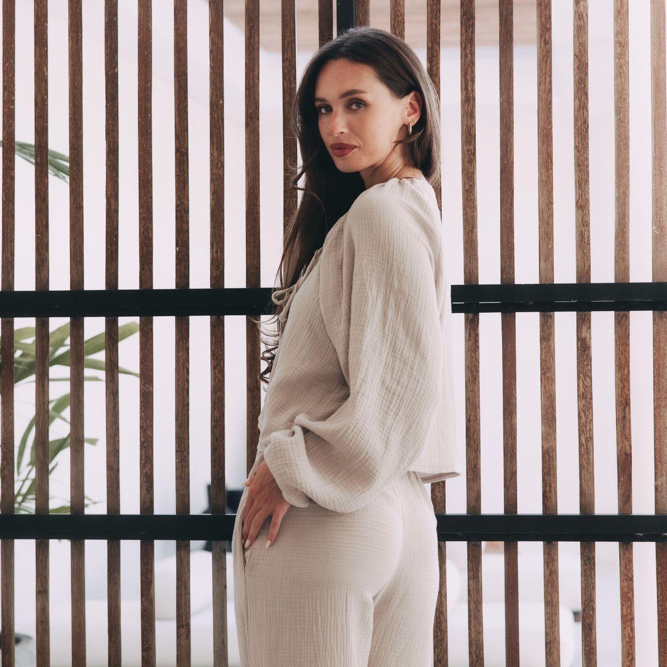 Zahaľte sa do jemnosti, ktorá pripomína dotyk letného vánku. Úžasne ľahký mušelínový top Zia sa stane vašou nepostrádateľnou súčasťou, či už sa chystáte na snovú dovolenku pri mori alebo hľadáte maximálny komfort pre pracovné dni v kancelárii. Svetlá béžová farba stelesňuje samotnú podstatu leta, pretože je svieža, čistá a neuveriteľne kombinovateľná.