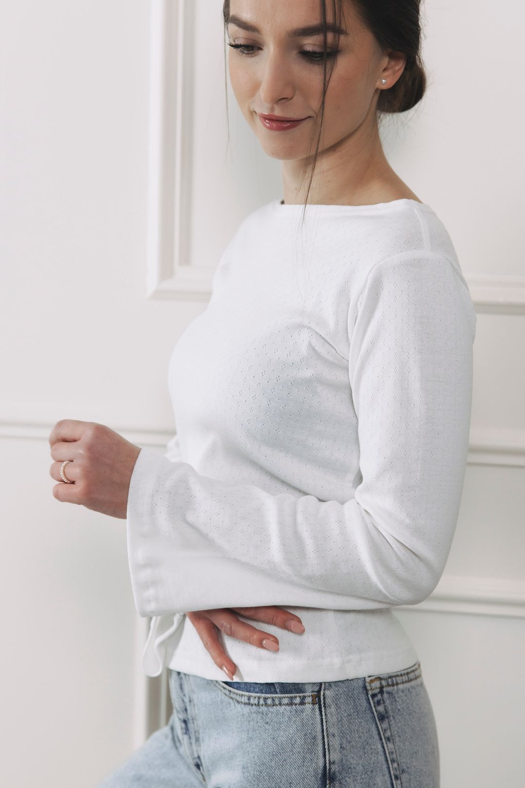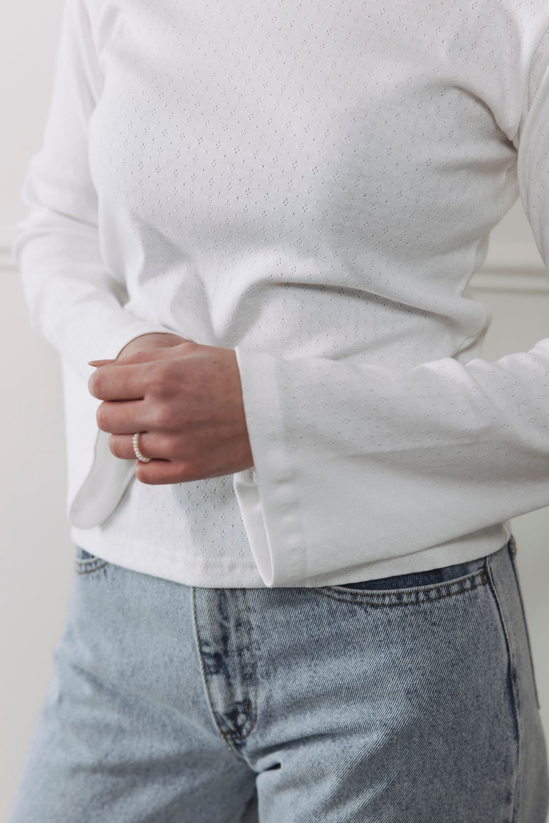 - Strih: Dlhý rukáv sa smerom dole zľahka rozširuje. Lodičkový výstrih opticky predĺži krk a dodáva eleganciu. Je o kúsok dlhšie, než obľúbené tričko Adebola, čo umožňuje pohodlné nosenie aj k nohaviciam s nižším pásom a pridáva tak na univerzálnosti.