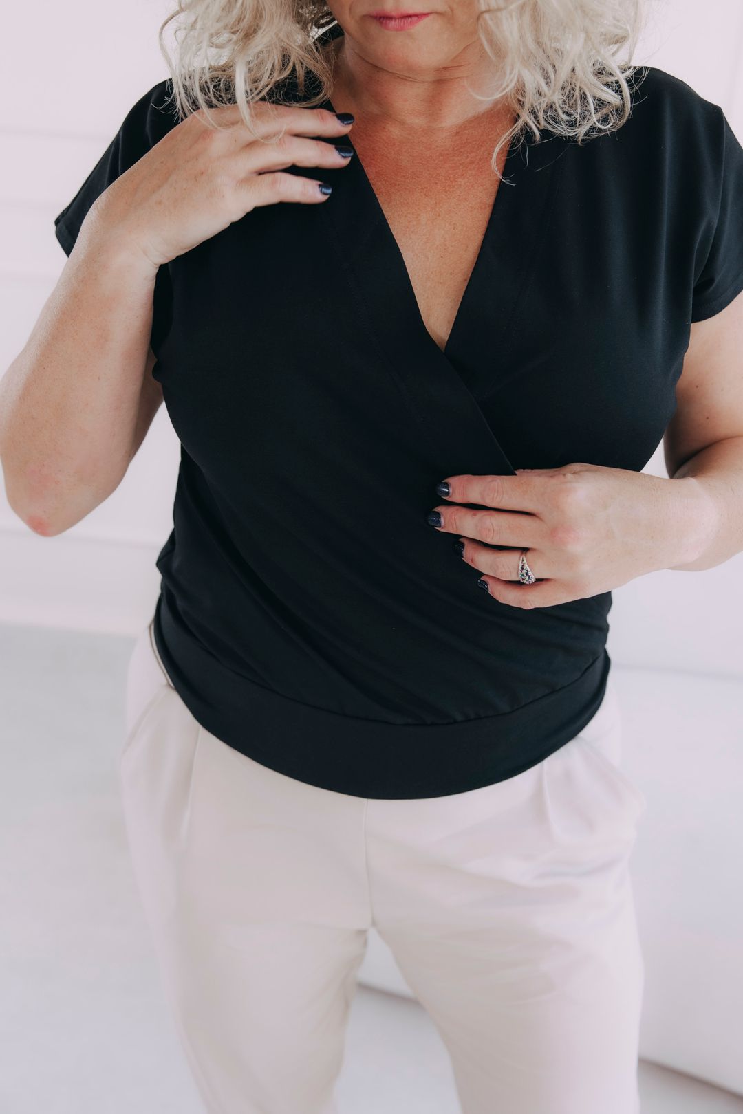 Vďaka voľnejšiemu prekríženiu na prednej strane odporúčame voliť menšiu veľkosť, než si bežne kupujete. Tričko vám vďaka tomu lepšie priľne k telu a perfektne sadne.