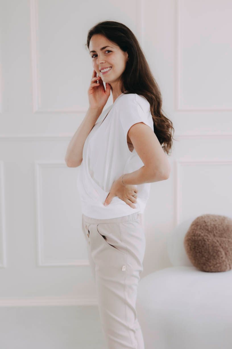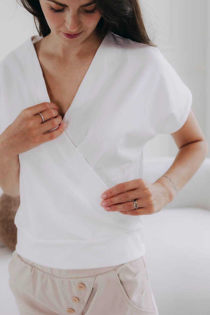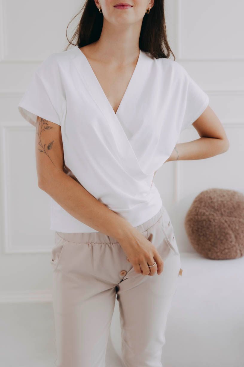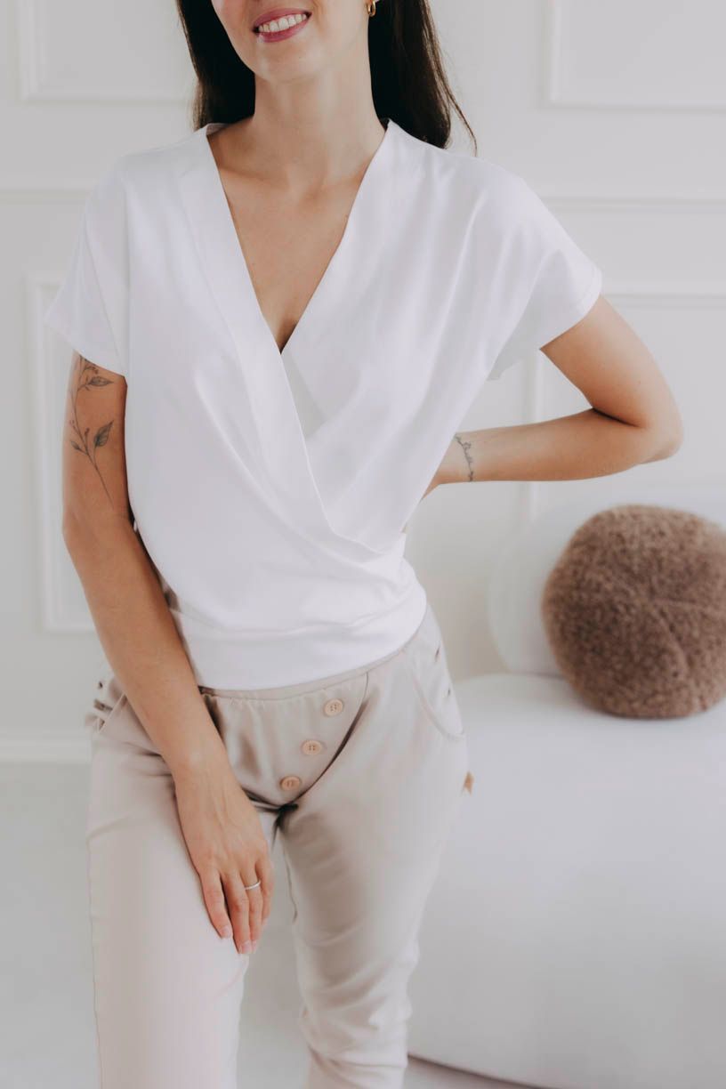 Vďaka voľnejšiemu prekríženiu na prednej strane odporúčame voliť menšiu veľkosť, než si bežne kupujete. Tričko vám vďaka tomu lepšie priľne k telu a perfektne sadne.