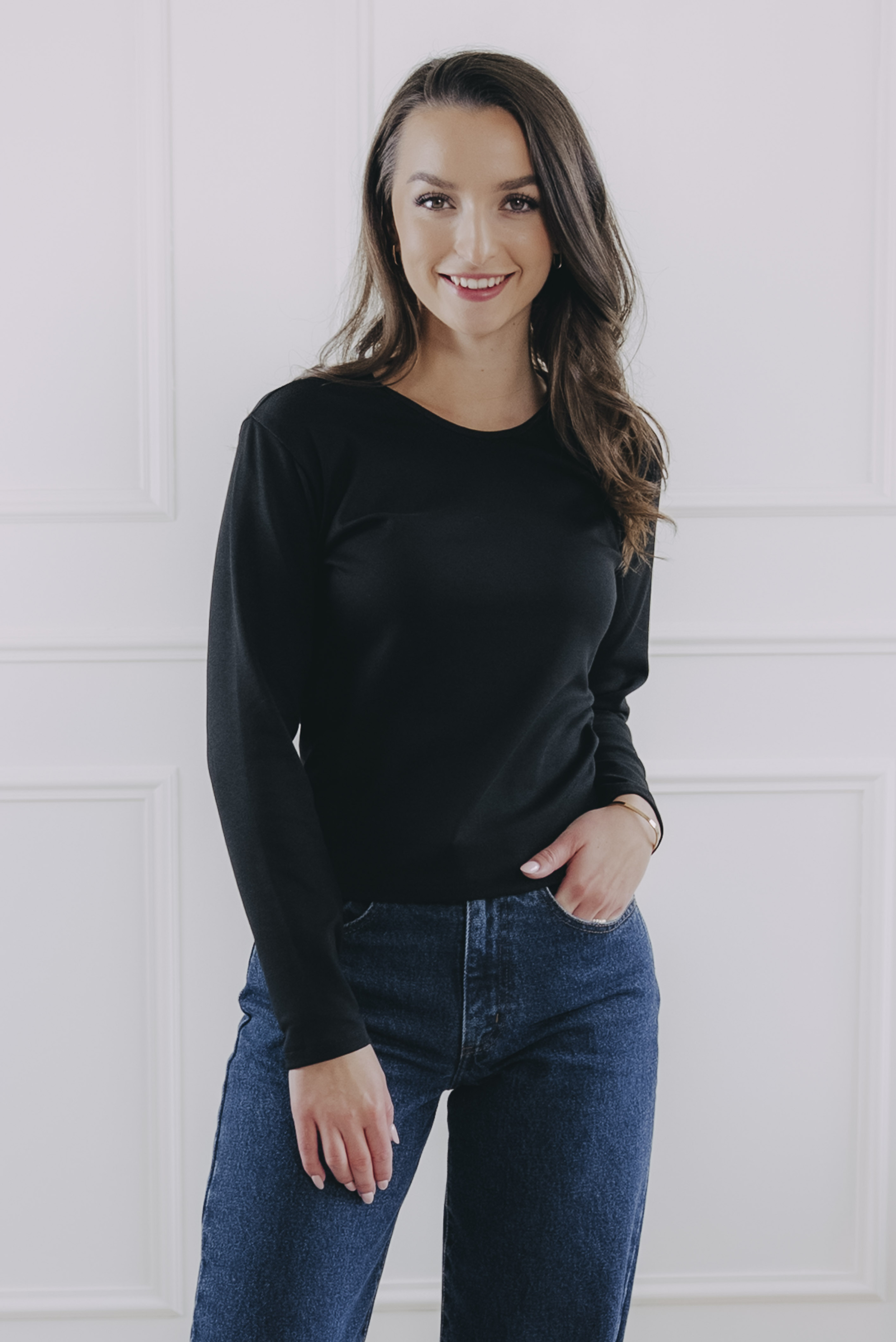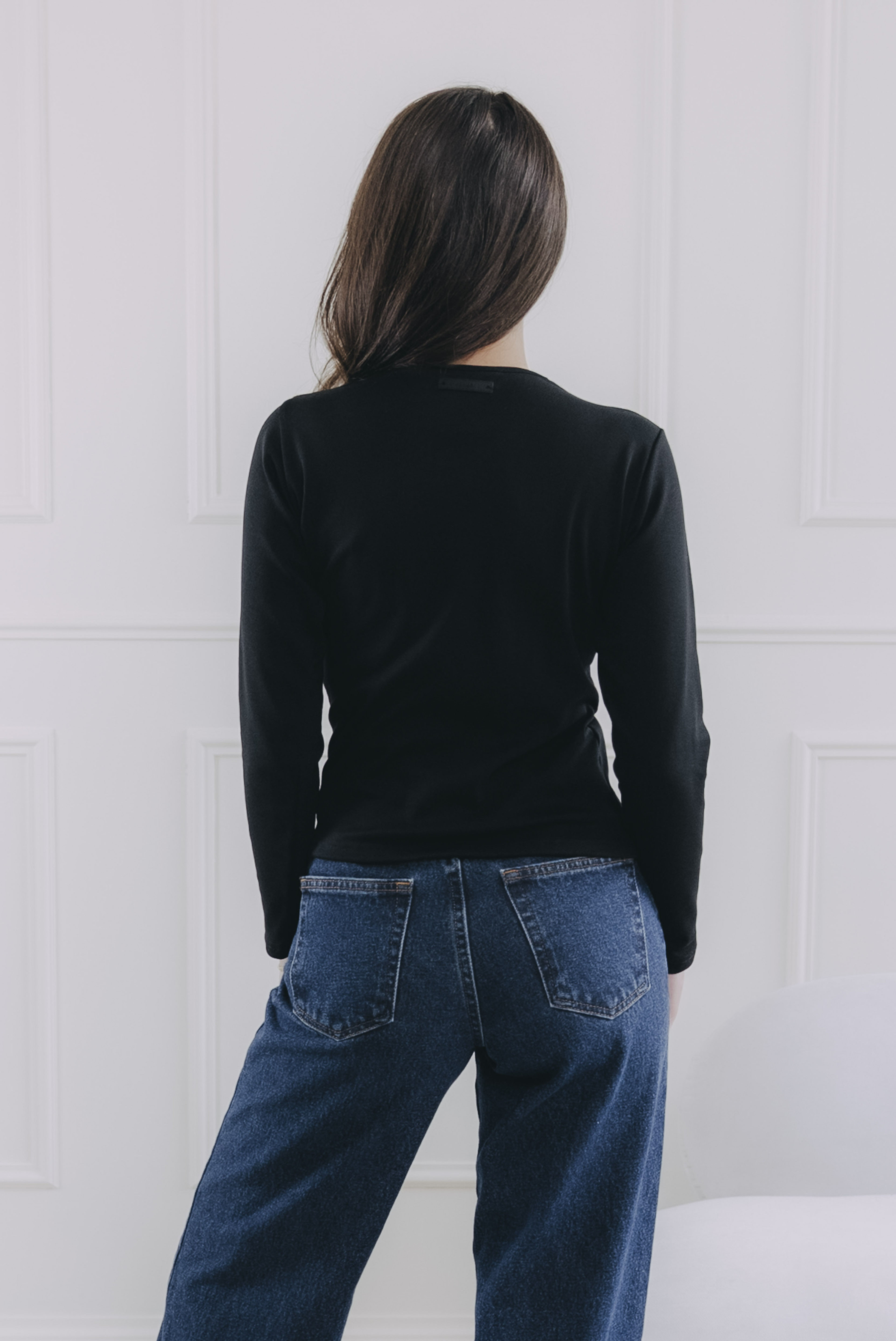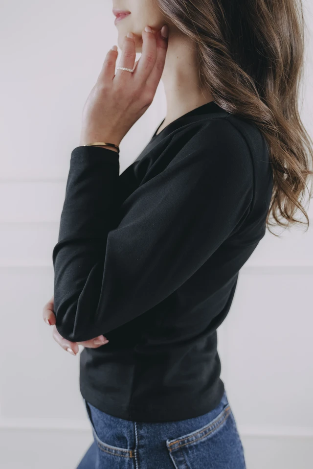 - Strih: Tričko má dlhý rukáv a okrúhly výstrih, ktorý opticky predlžuje krk.