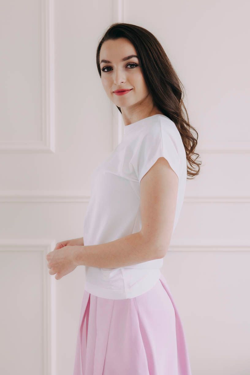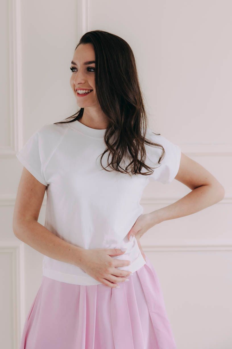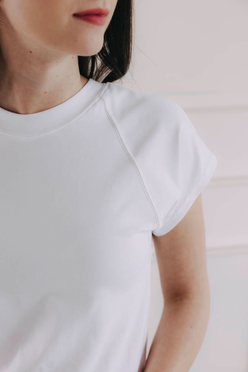 Ušili sme ho z hebkej bavlny s trochou elastanu, takže pruží a krásne sedí na postave. Hladký náplet pri okrúhlom výstrihu je výrazným a pritom splývavým detailom. A dĺžka? Tak akurát pod pás, takže vyzerá skvele, či už ho necháte voľne splývať, alebo ho elegantne zastrčíte do nohavíc či sukne s vyšším pásom. Na doma, do mesta aj do práce.