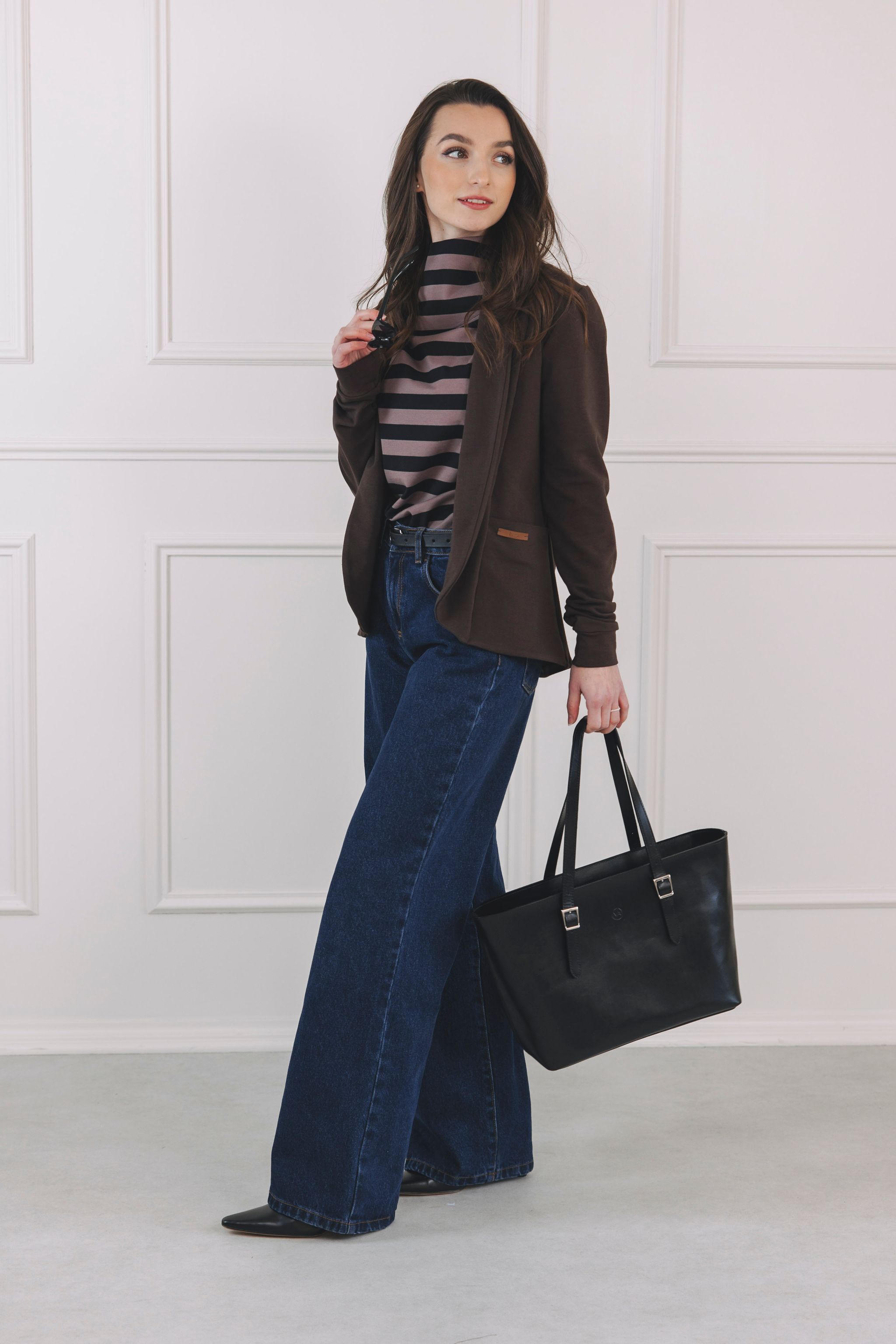 Elegantná diva: Zastrčte Izi do sukne Mawe alebo do nohavíc s vysokým pásom a prehoďte naše sako Ania. Vďaka netopierím rukávom, ktoré sa zužujú k zápästiu, nič netlačí a silueta zostáva čistá. Outfit doplňte koženou kabelkou a jednoduchými lodičkami.