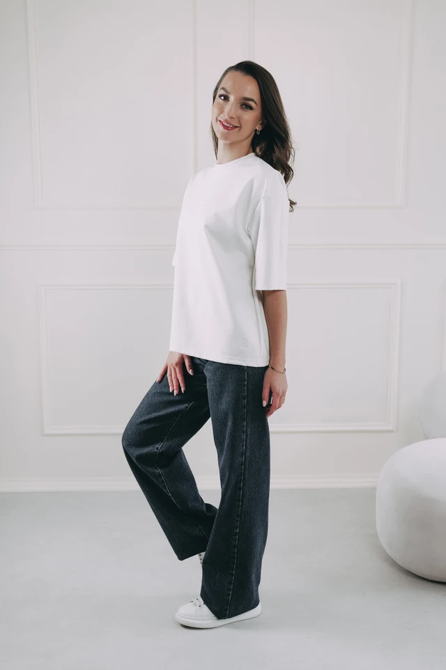 - Strih: Tričko Jengo je voľnejšie a predĺžené, na tele krásne splýva. Rukávy majú uvoľnený, znížený strih a tričku tak dodávajú ten správny ležérny vibe.