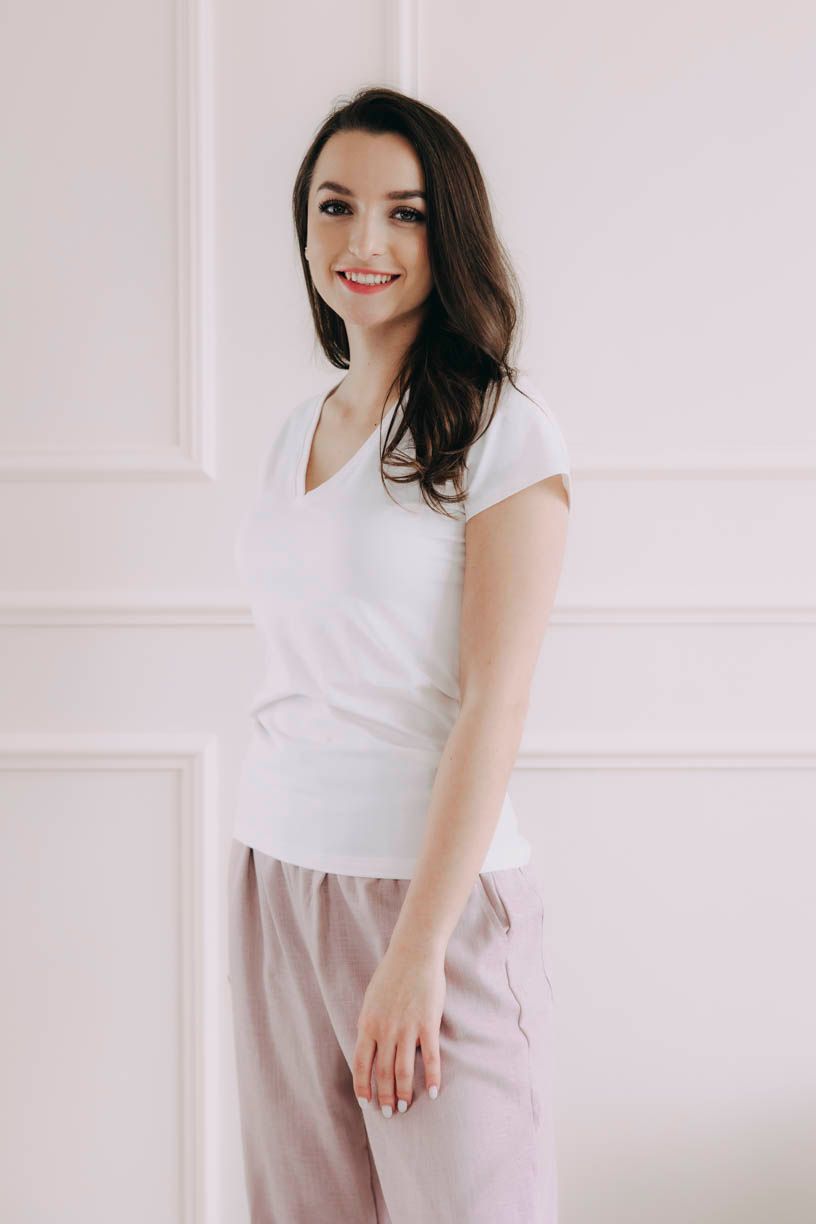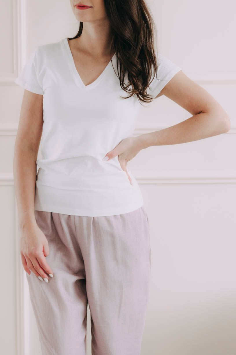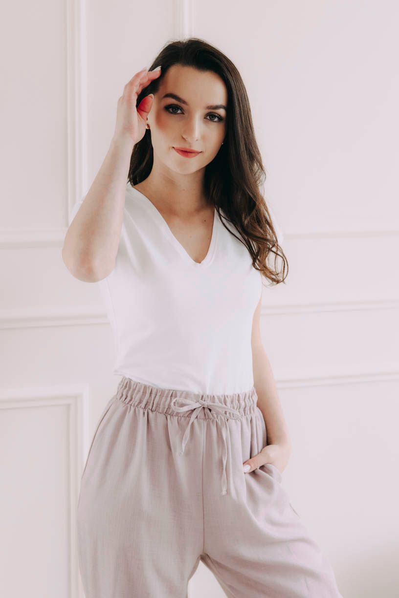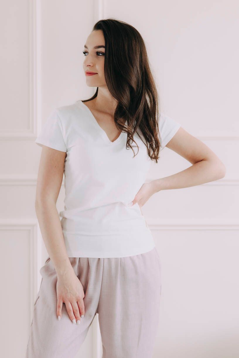 Tričko Kalisha s výstrihom do V, ušité z príjemnej bavlny s elastanom, sa ľahko stane základom vášho šatníka – na každodenné nosenie aj špeciálne príležitosti.