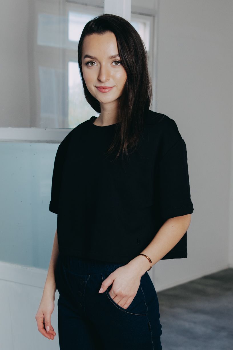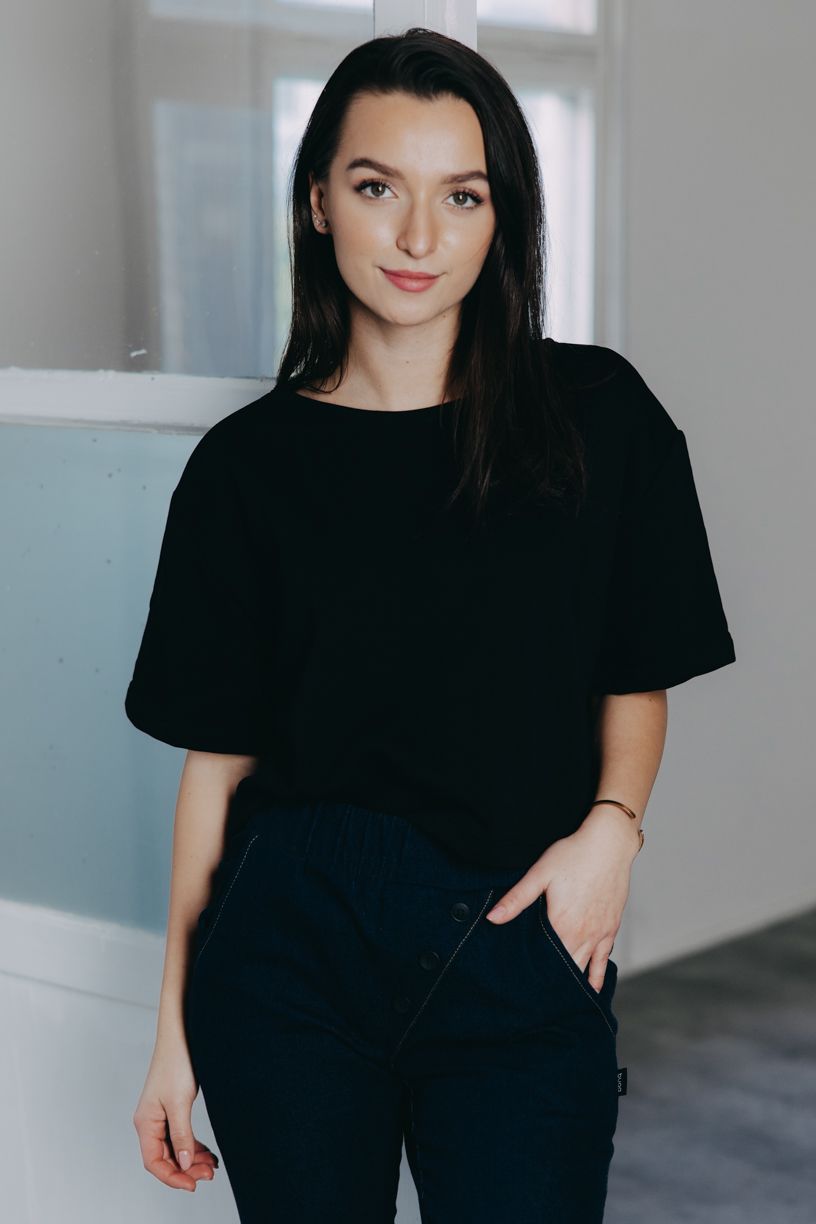 Nie je nič otravnejšie, ako keď sa vám tričko vyhŕňa a nedrží ani zastrčené. Naša Peťa nájde riešenie na akýkoľvek problém s oblečením. Efektné tričko Kayla vychádza zo strihu trička Jini, ktoré sme v polovici odstrihli. Vznikol príjemne voľný bavlnený top, s širokými rukávmi, ktorý krásne doplní výraznejšie kúsky.
