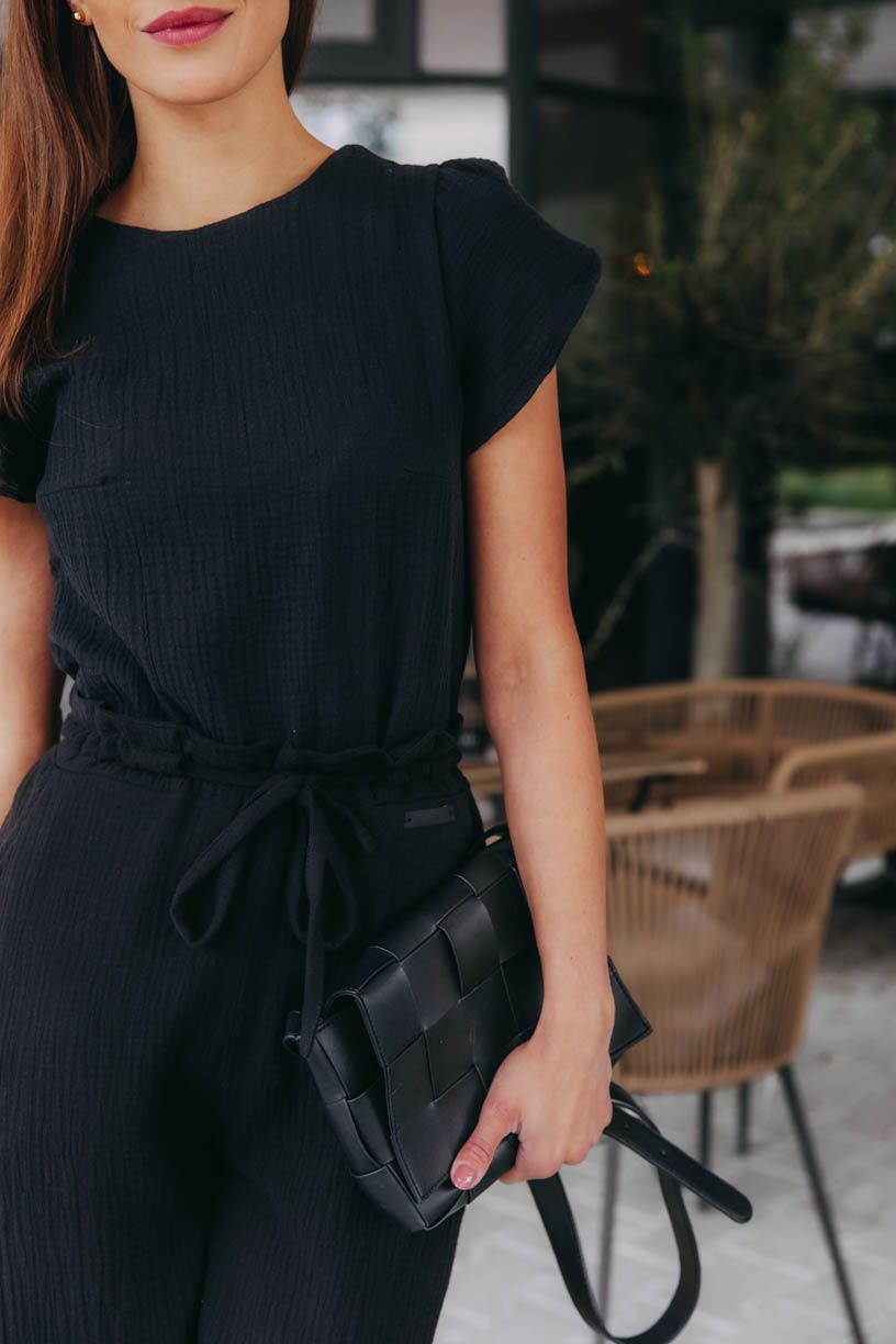 Čierne mušelínové tričko Kemi s nápadito riešenými rukávmi a praktickou gumičkou v páse na podkasanie je skvelým parťákom na letné dni a nekonečné kombinovanie.