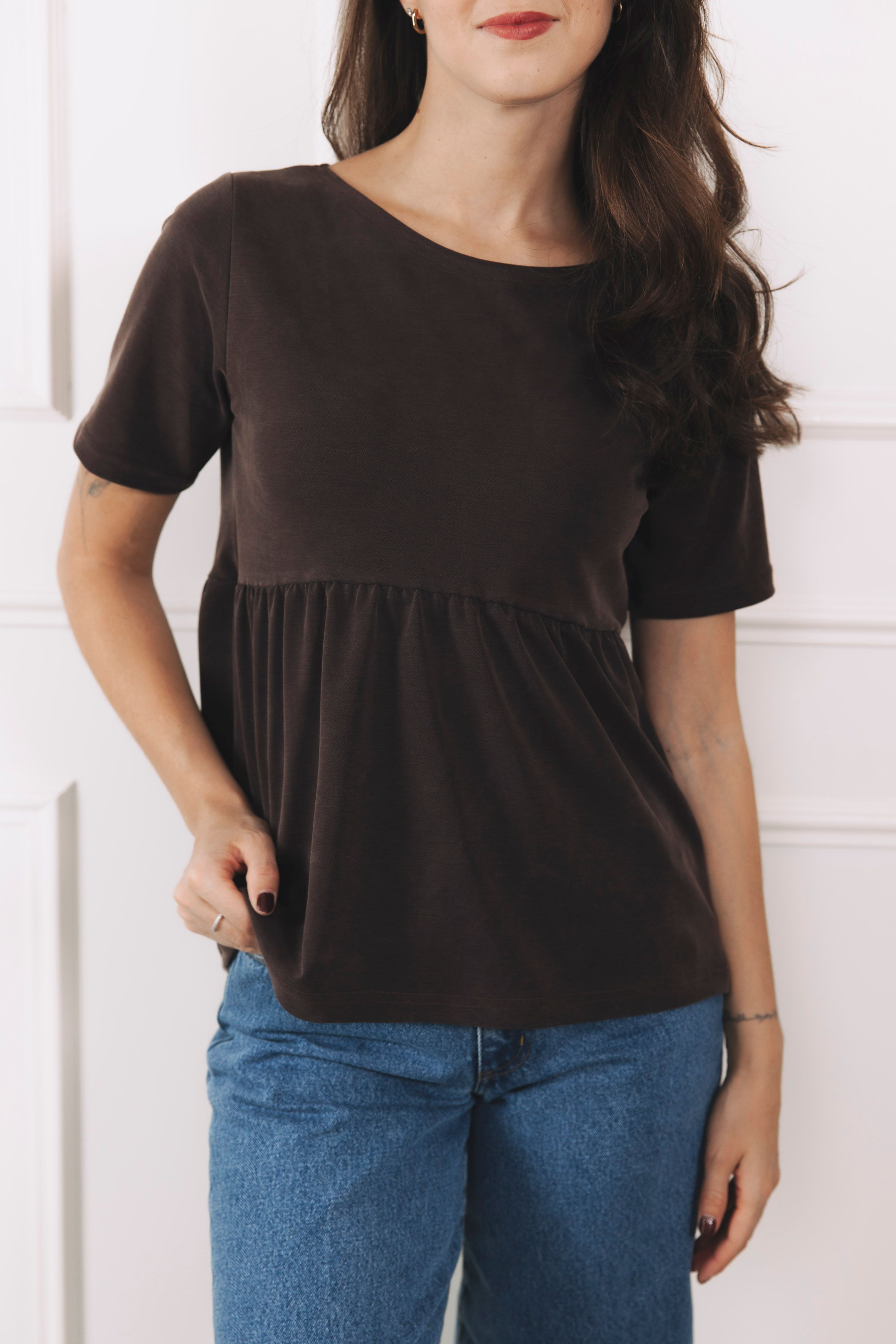 Keby malo pohodlie svoj vlastný dress code, vyzeralo by presne takto. Hnedé tričko Liya je Hero Piece na tie dni, keď neviete, čo si obliecť, ale viete, že sa chcete cítiť skvelo. Táto elegantná blúzka s jemným riasením je vďaka luxusnému materiálu neuveriteľne príjemná a splývavá – budete ju chcieť nosiť neustále. V sýtej čokoládovej farbe a s hravým volánom sa postará o to, aby ste sa cítili žensky, uvoľnene a predovšetkým nádherne.