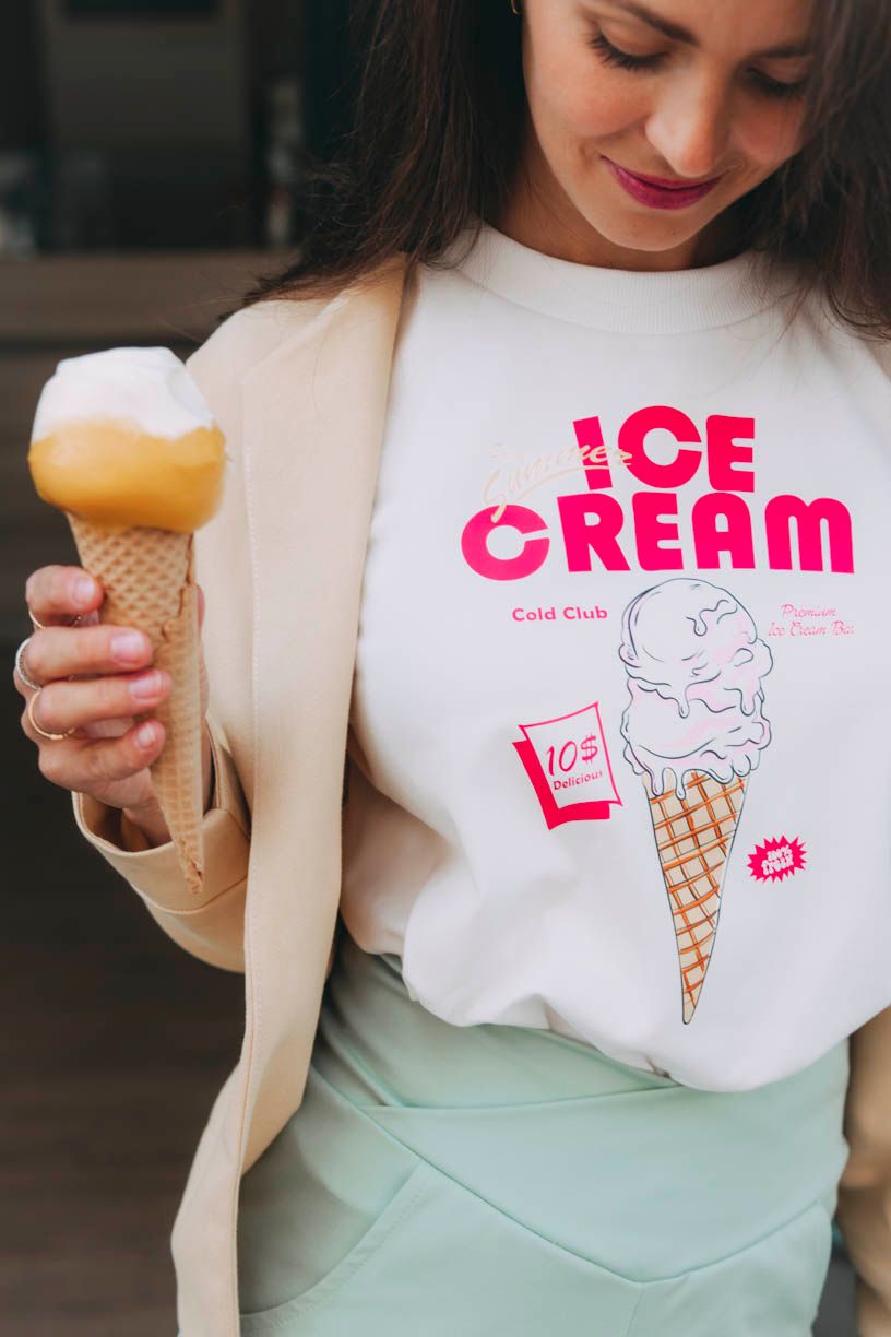 Slnko síce nesvieti každý deň, ale nálada môže. Zmrzlina je nálada ľahkosti, sladkosti a hravosti – taká, čo sa roztápa lenivo a pomaly a zanecháva jasnú a nezmazateľnú (teda nevyprateľnú) stopu. Aj obyčajný pondelok môže chutiť ako… napríklad jahodová. Stačí sa podľa toho obliecť.