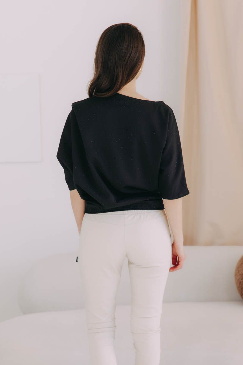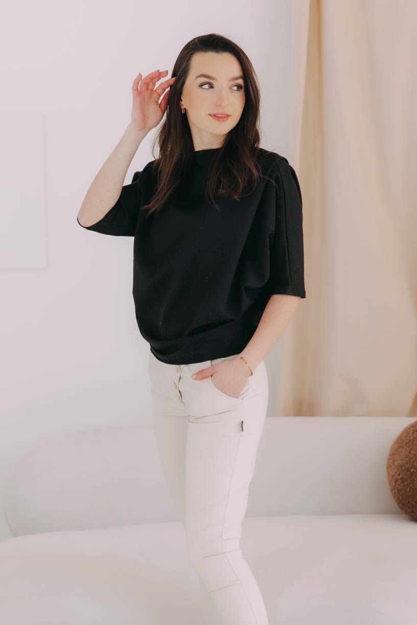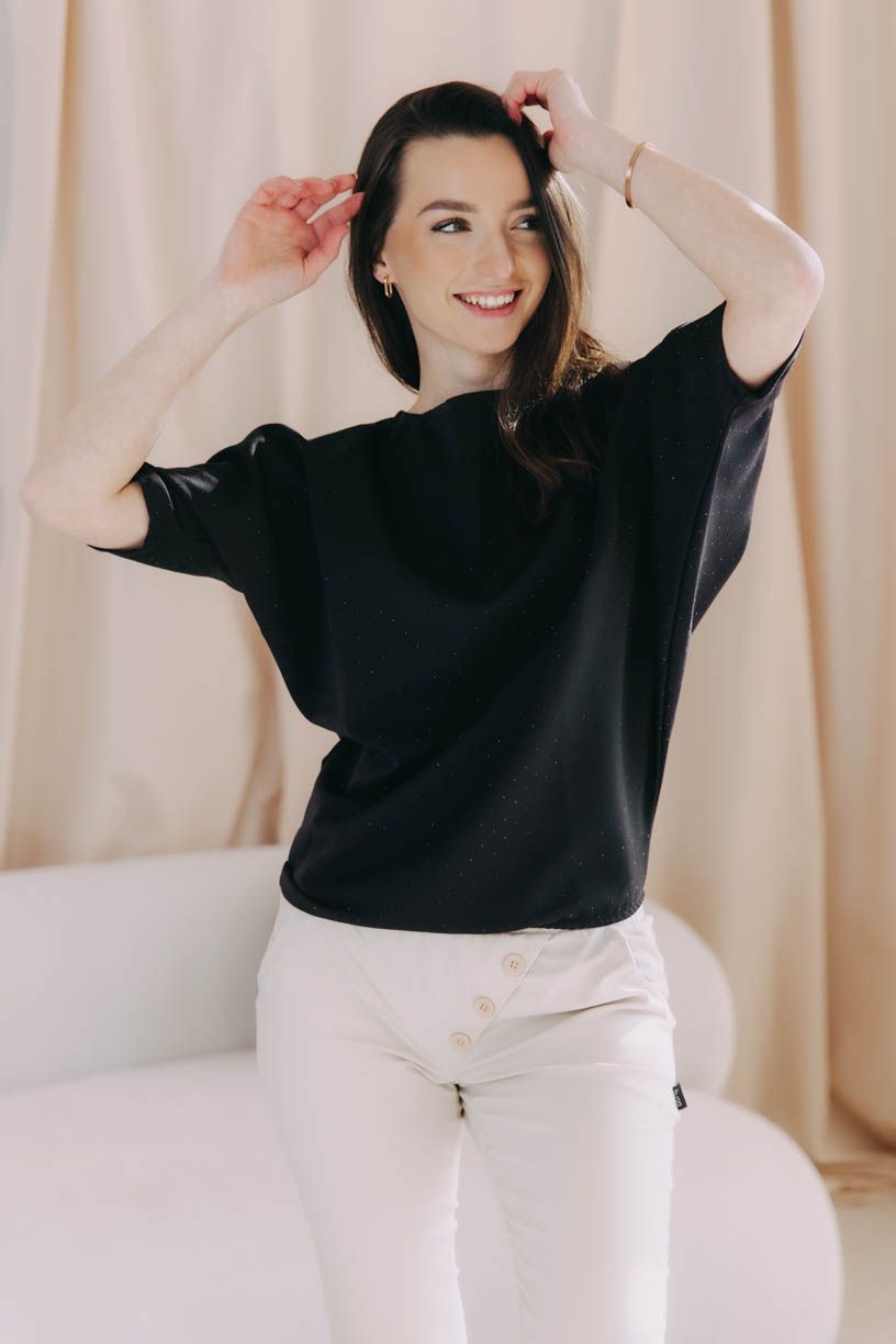 Nesmierne elegantné tričko Yoko z pevnejšieho materiálu a s netopierími rukávmi je posiate trblietkami, ktoré vás rozžiaria pri každej špeciálnej príležitosti.