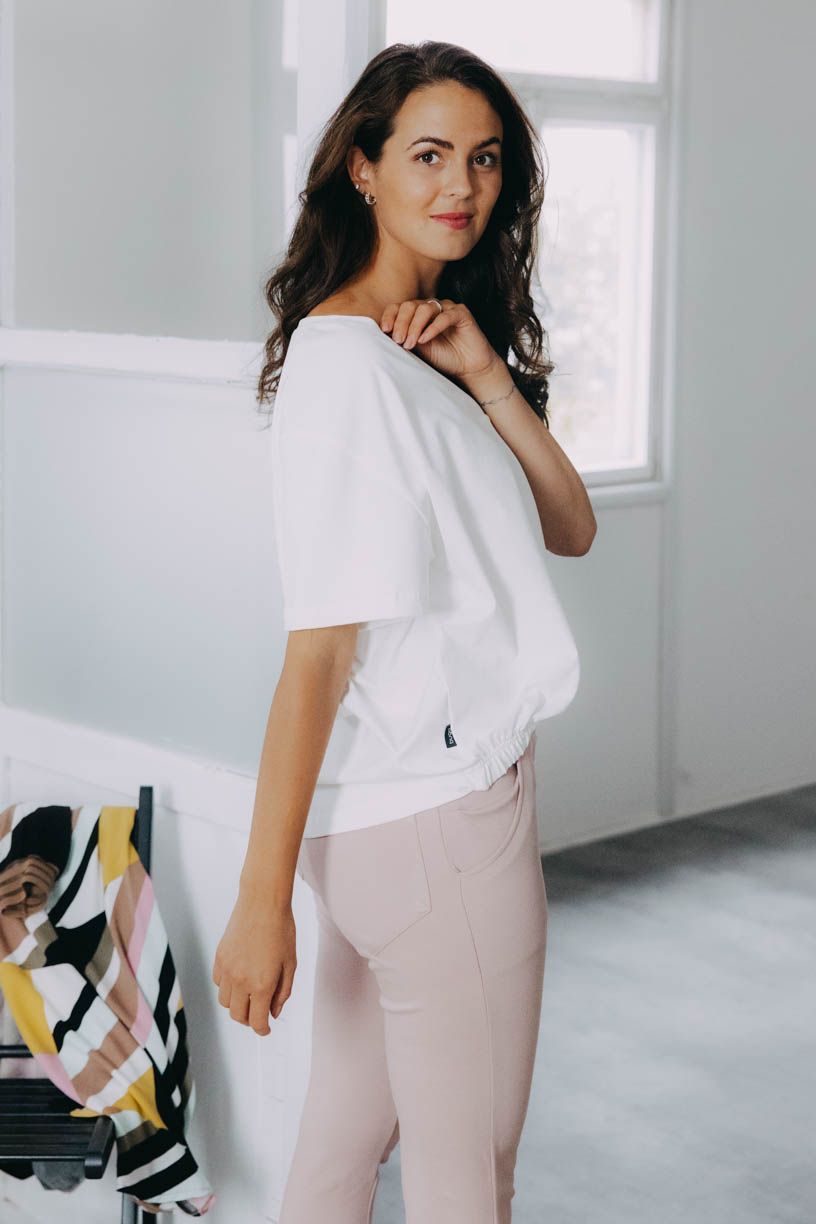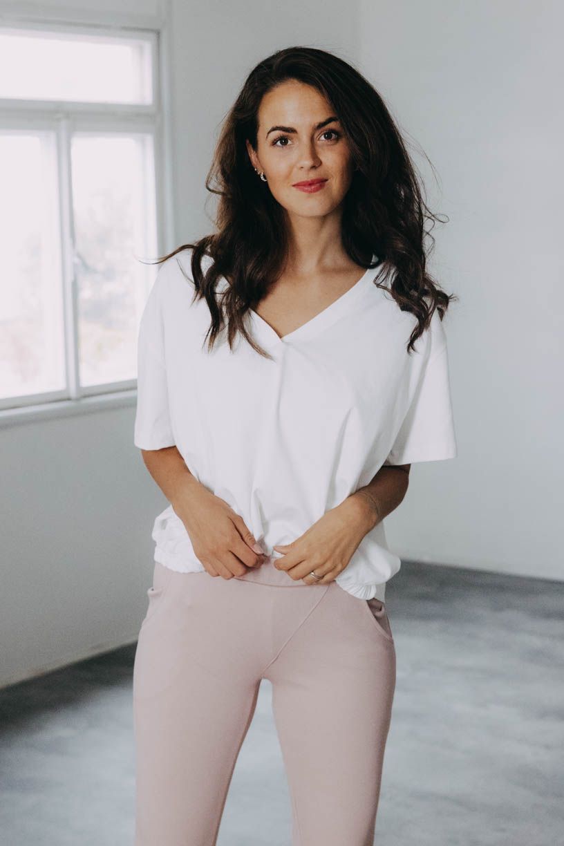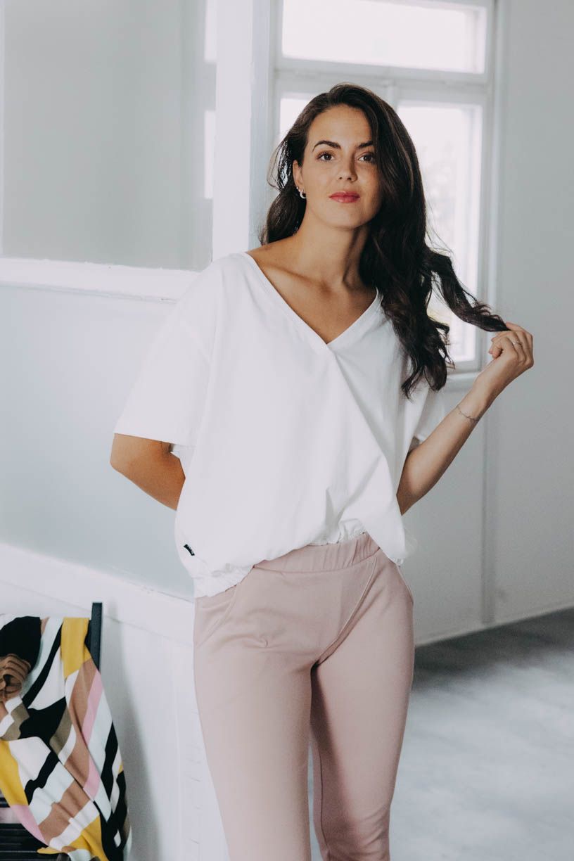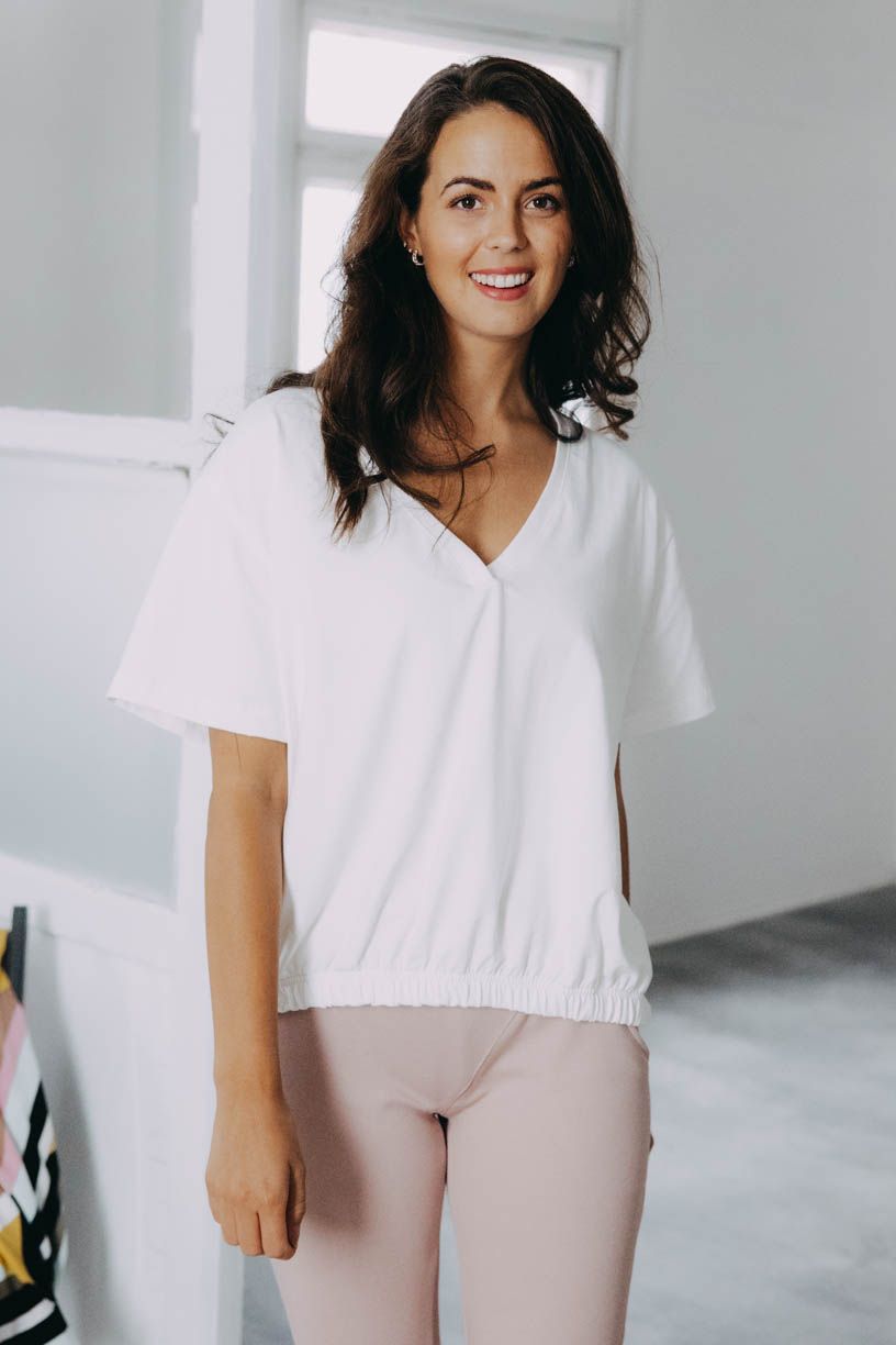 Pohodlné basic tričko, ktoré má šmrnc? To Safu spĺňa na 100%. Kratšia predná časť s všitou gumou na podkasanie a výstrih do V skvele doplní každý outfit.