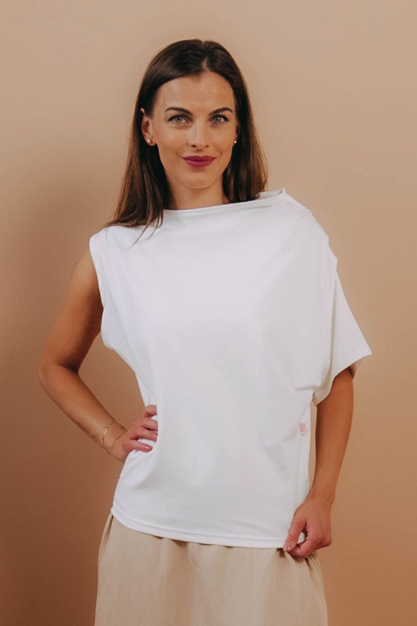 Asymetrické tričko Samia netopierieho strihu zaujme netradične riešenými rukávmi. Skvele kombinovateľný minimalistický kúsok. A pritom tak originálny.