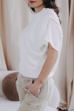 Kúzlo v tomto minimalistickom, ale prudko originálnom tope je nielen v jeho lichotivom netopierom strihu, ale aj v asymetricky riešených rukávoch. Jeden odhaľuje ruku až k ramenu, zatiaľ čo ten dlhší zaujme nápaditými skladmi.