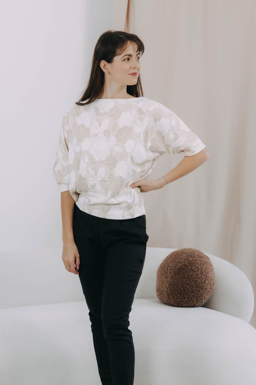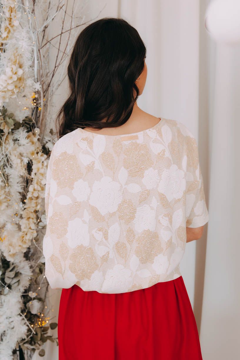 Elegantné lesklé tričko Yoko Gold Flowers s netopierími rukávmi je posiate kvetmi v zlatistých tónoch, ktoré vás rozžiaria pri každej špeciálnej príležitosti.